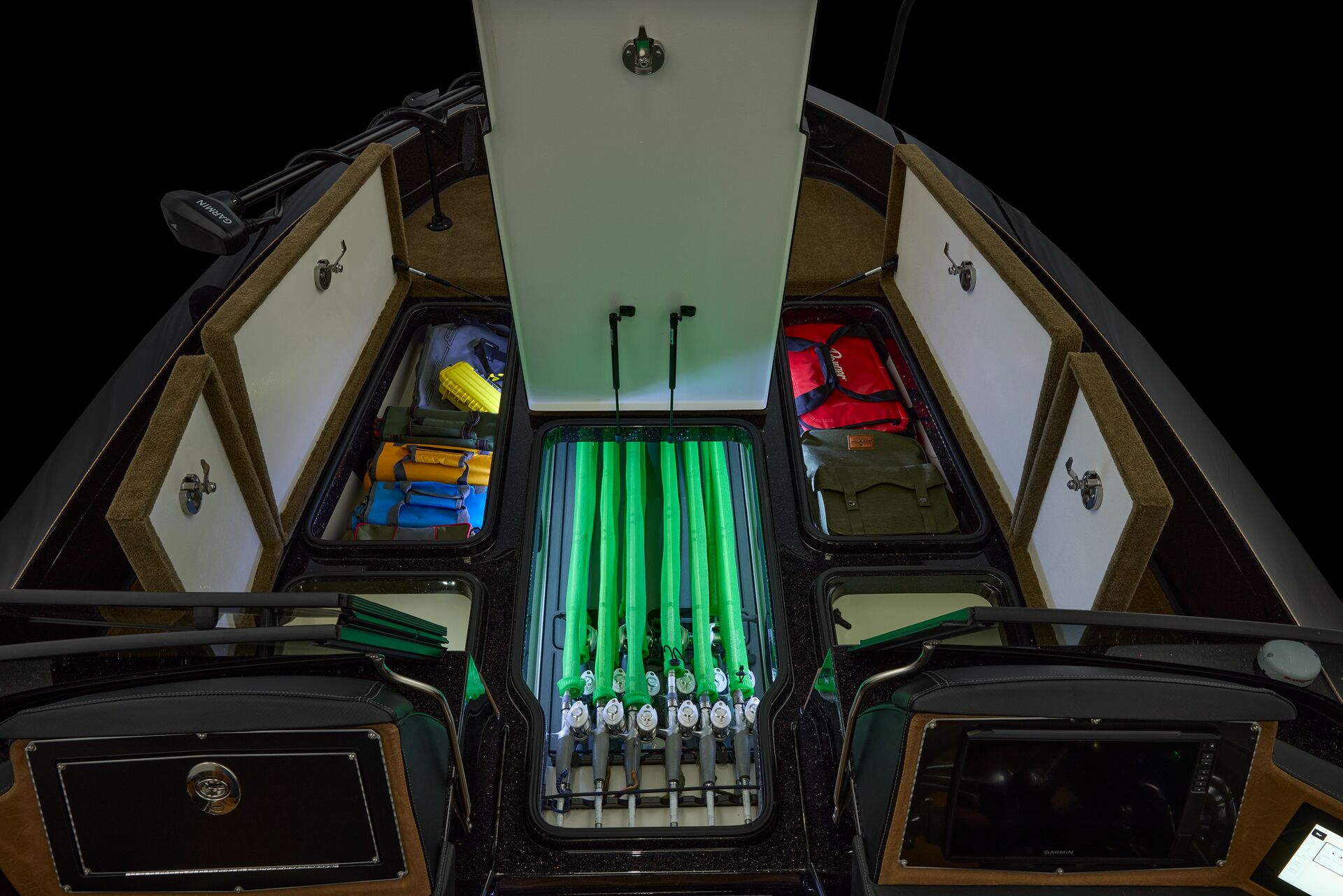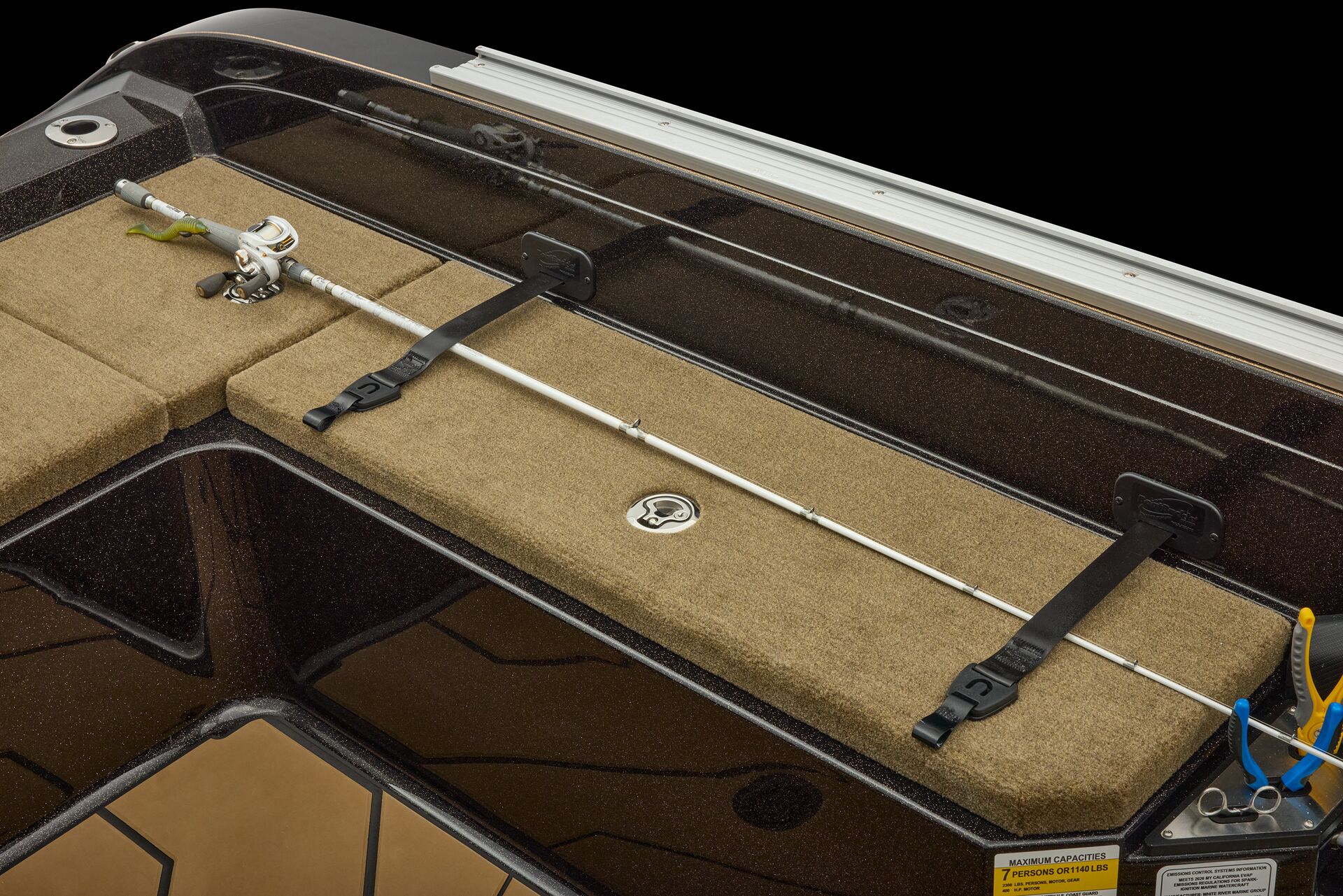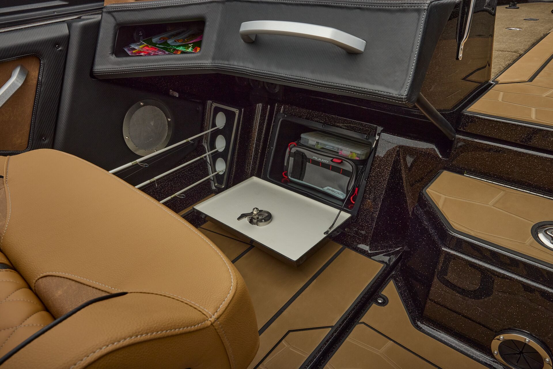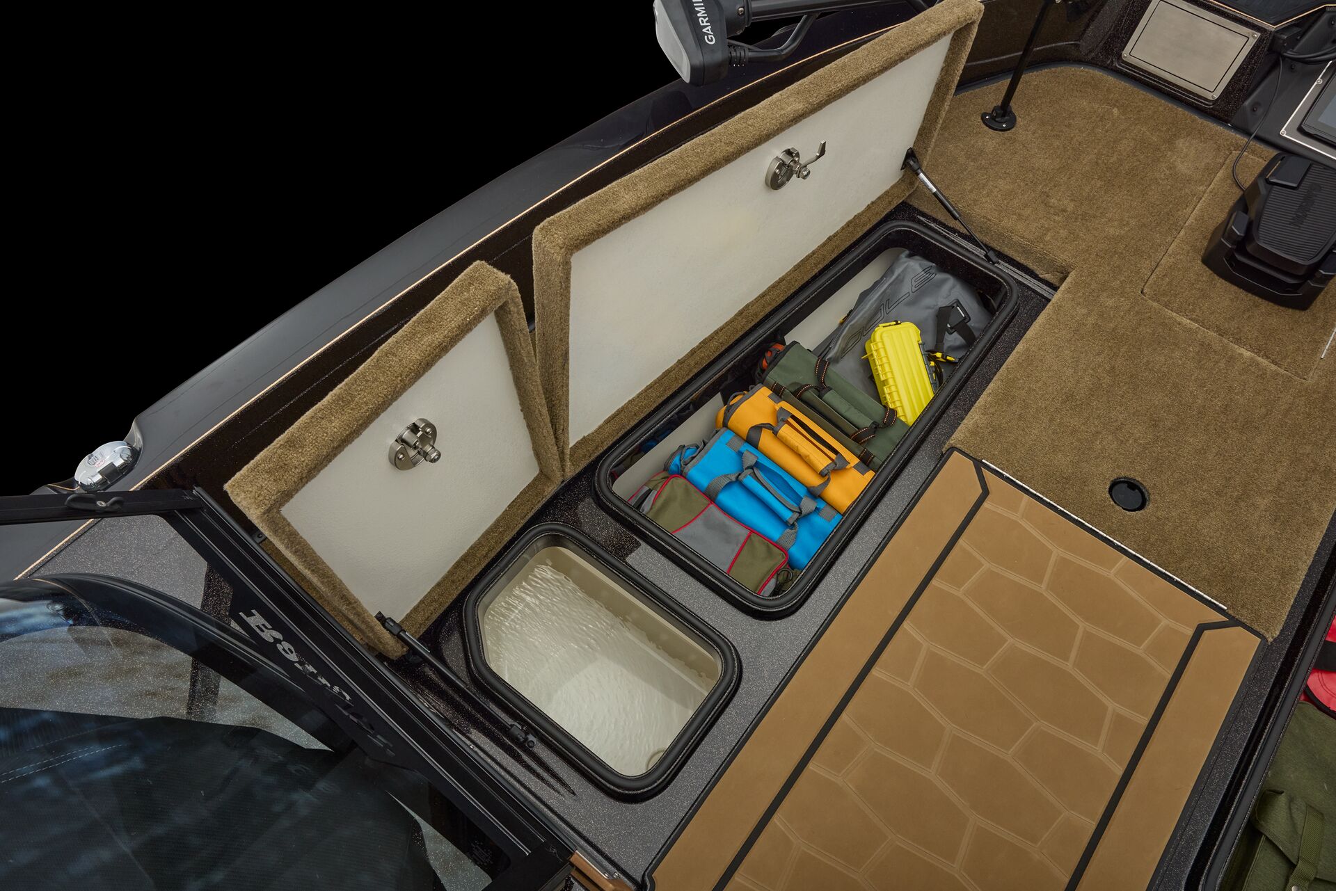 stepping through the distortion-free walk-thru windshield to the colossal back deck is an angler’s delight. Traction pad flooring with Comanche stripes adds functional beauty, while the stern houses tackle storages, dryboxes, and a massive livewell built to