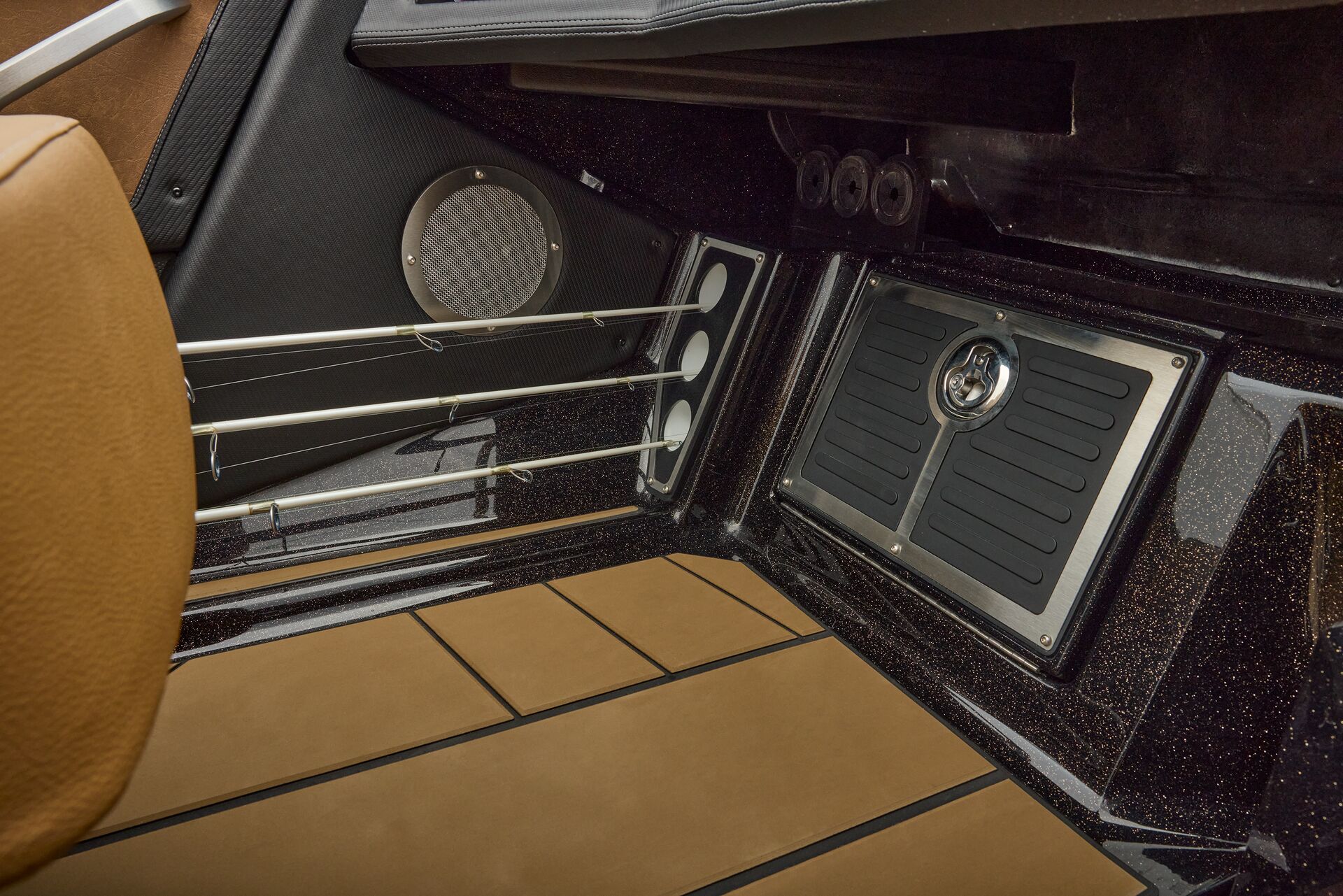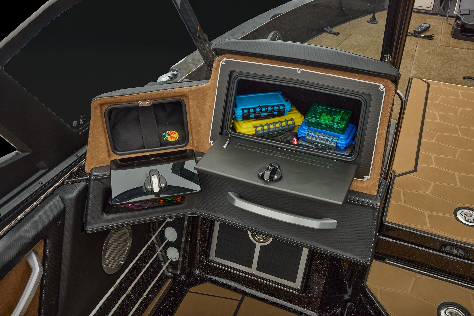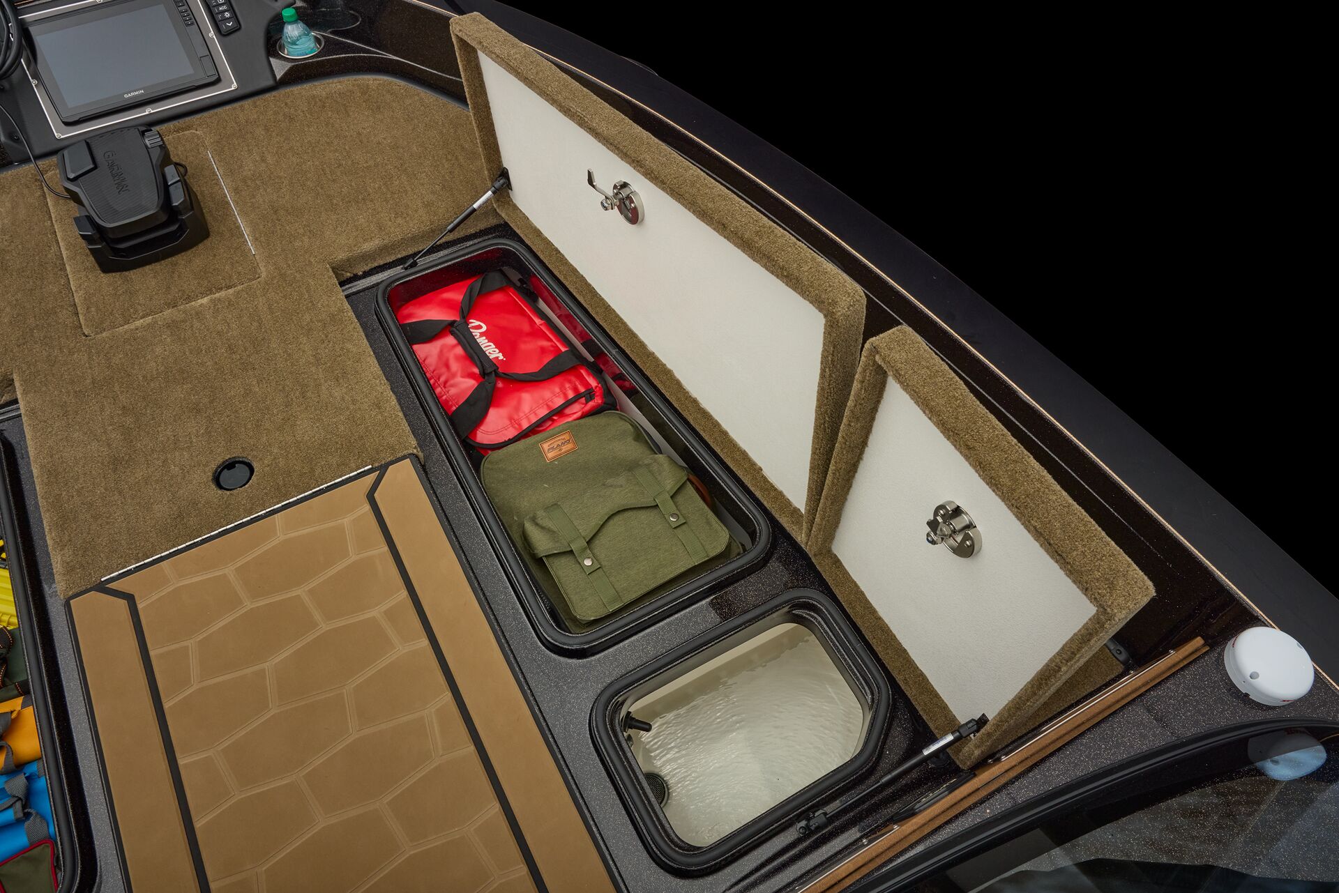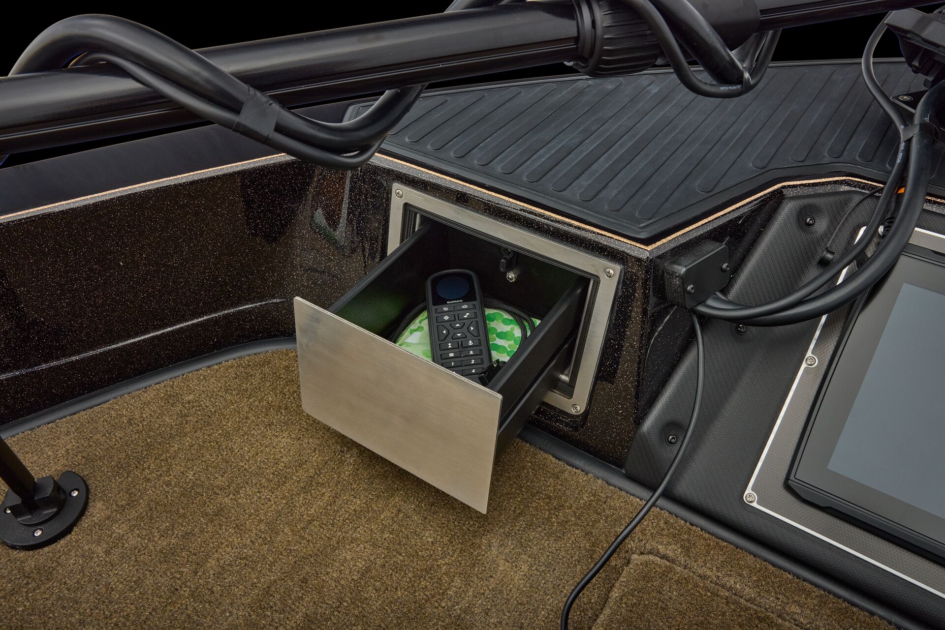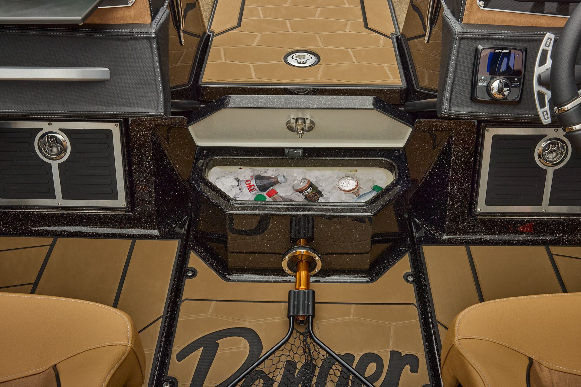 stepping through the distortion-free walk-thru windshield to the colossal back deck is an angler’s delight. Traction pad flooring with Comanche stripes adds functional beauty, while the stern houses tackle storages, dryboxes, and a massive livewell built to