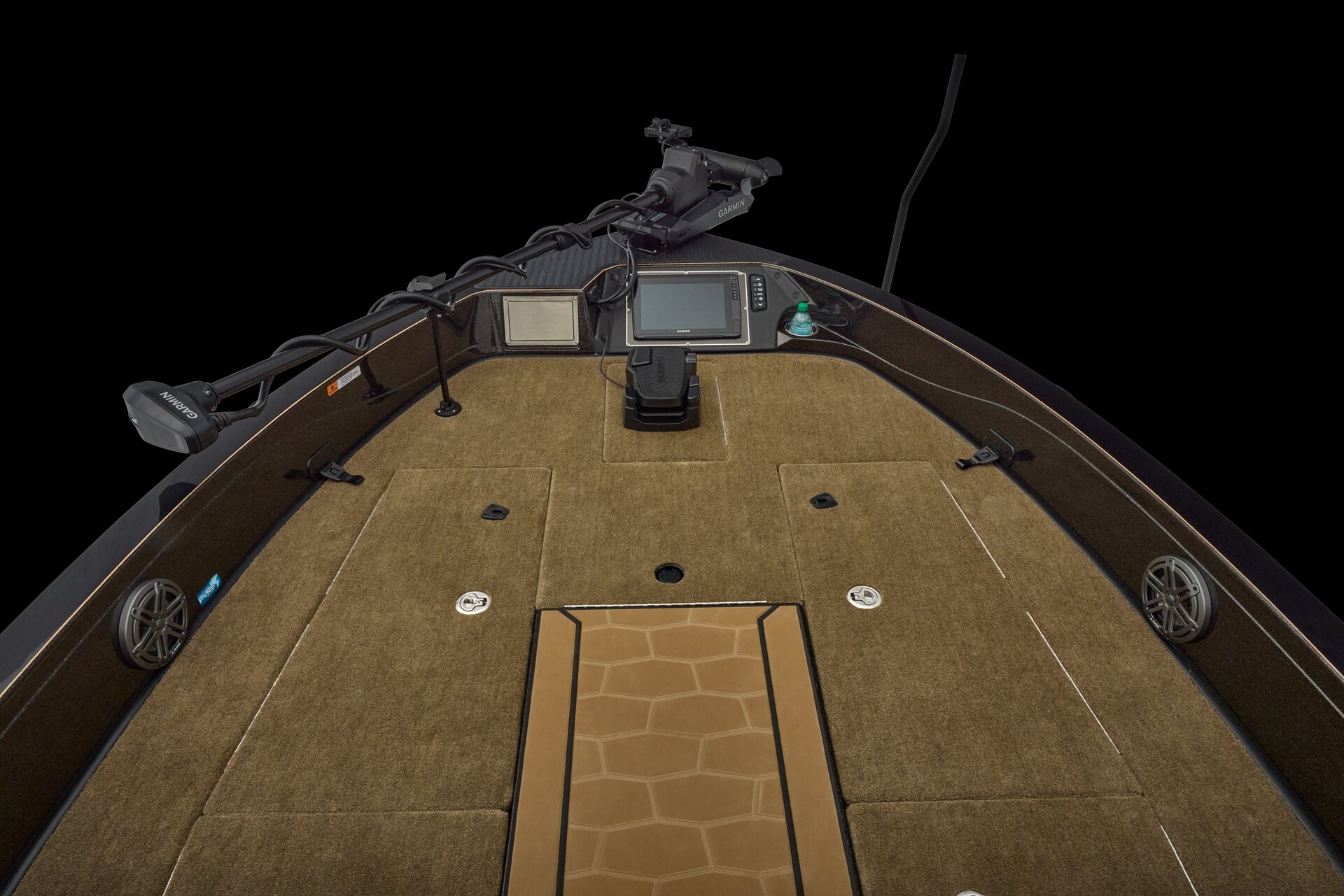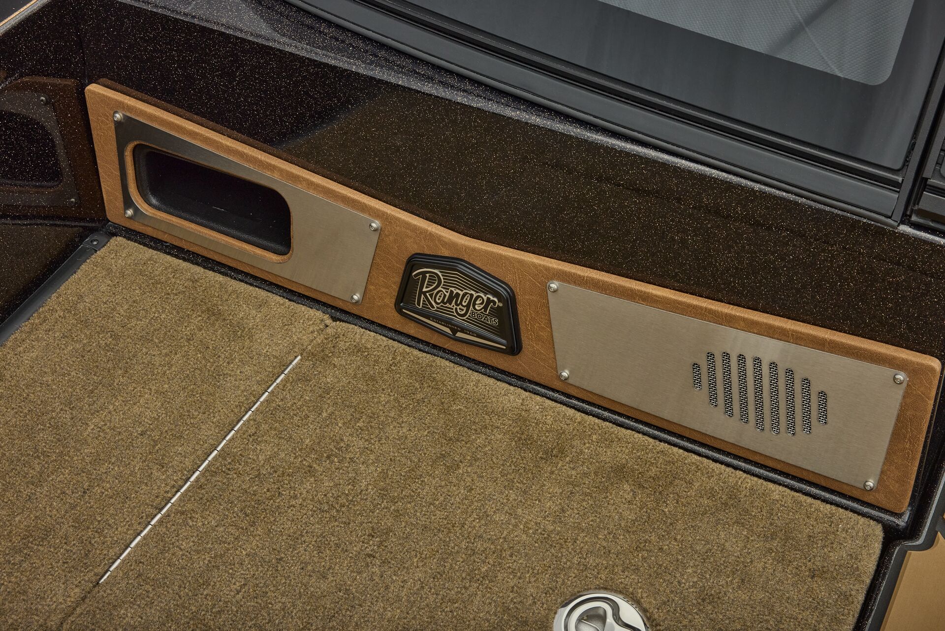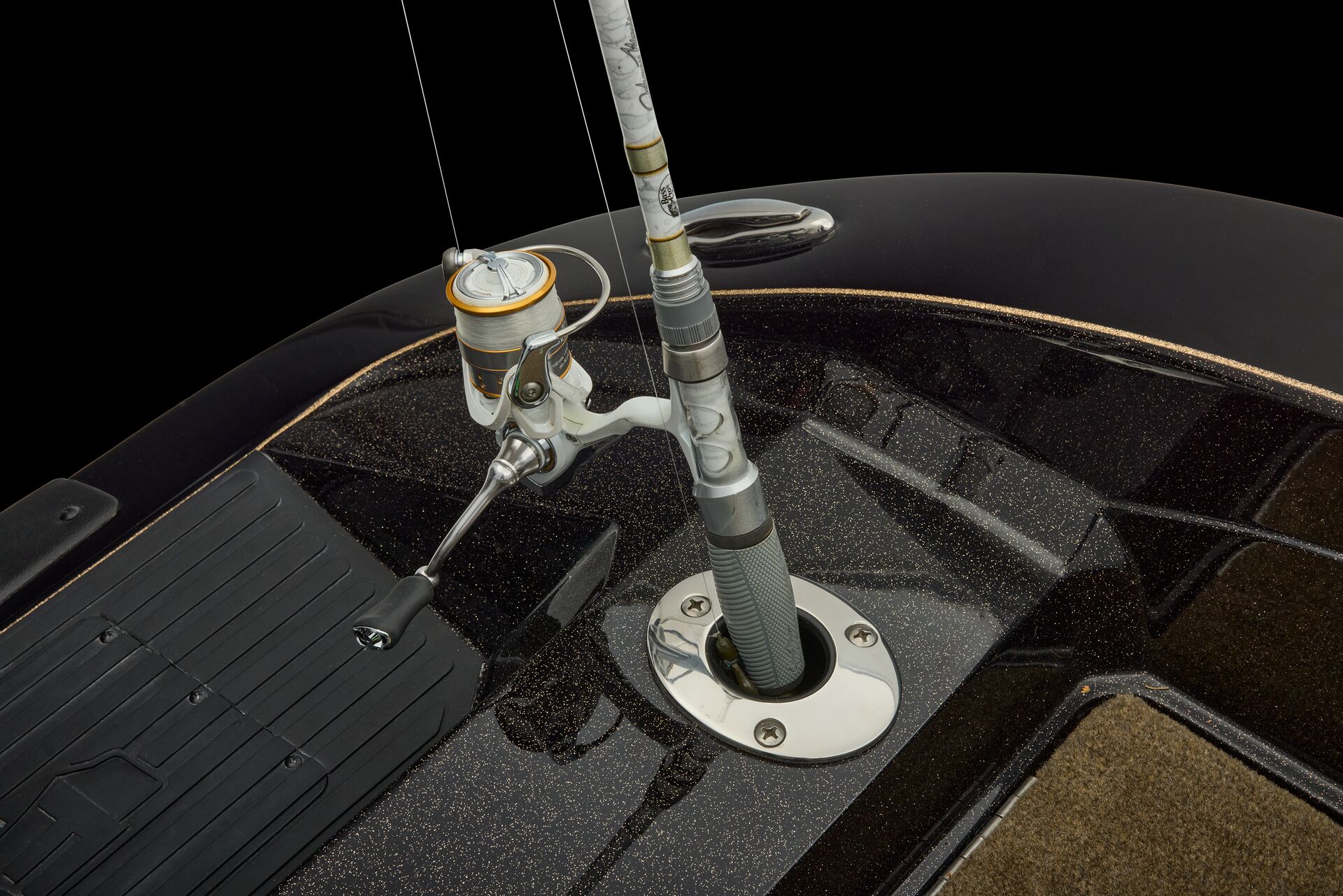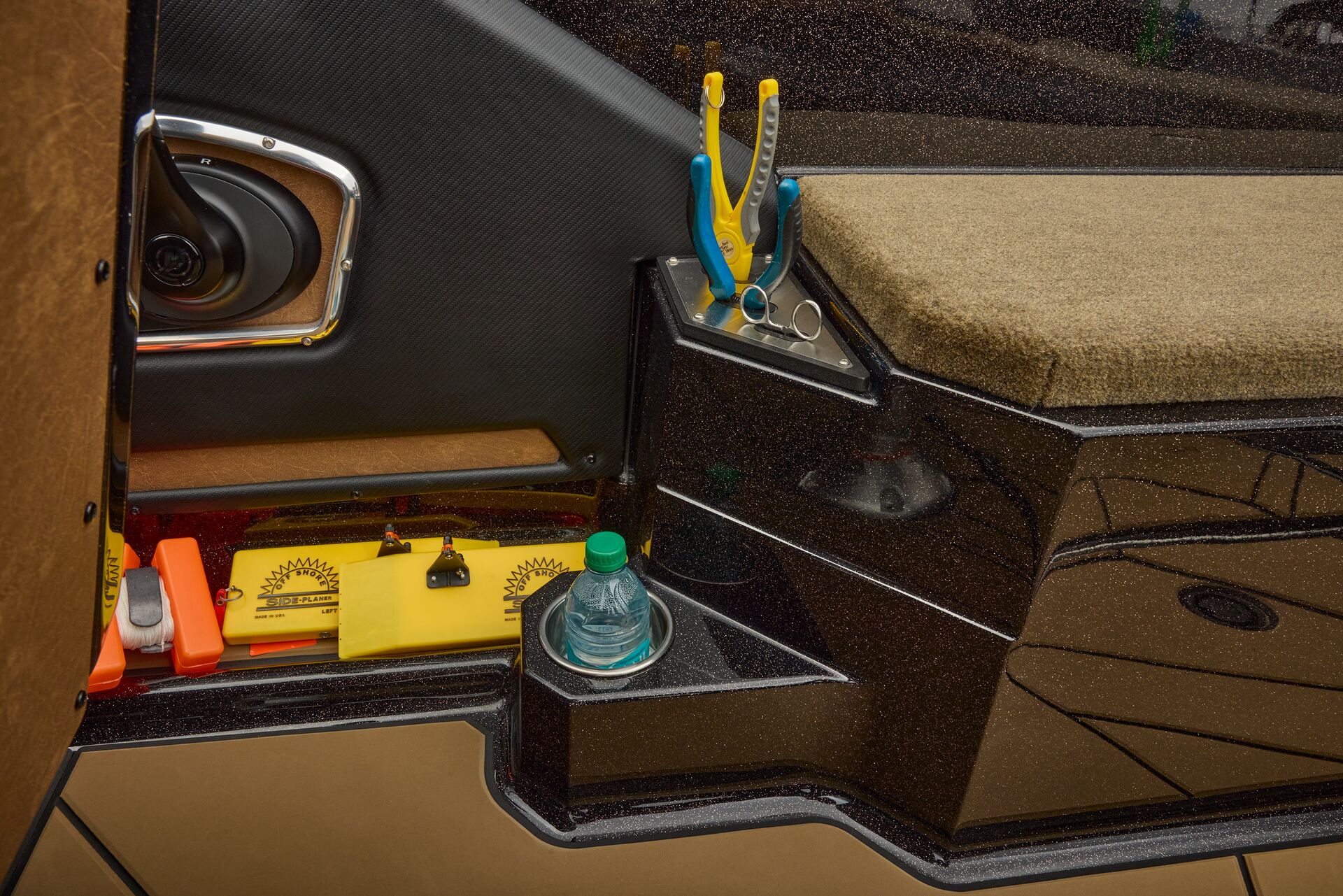 stepping through the distortion-free walk-thru windshield to the colossal back deck is an angler’s delight. Traction pad flooring with Comanche stripes adds functional beauty, while the stern houses tackle storages, dryboxes, and a massive livewell built to