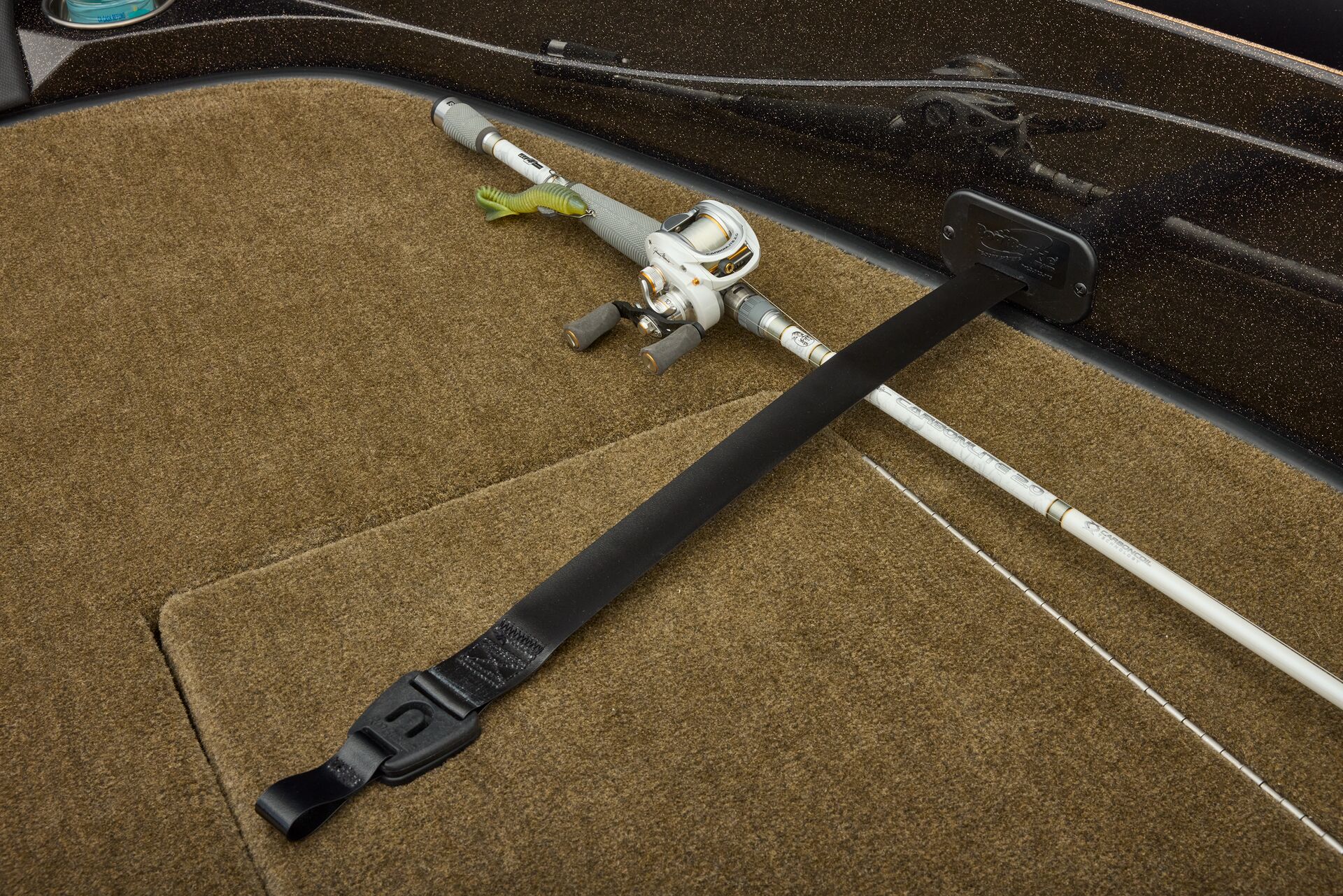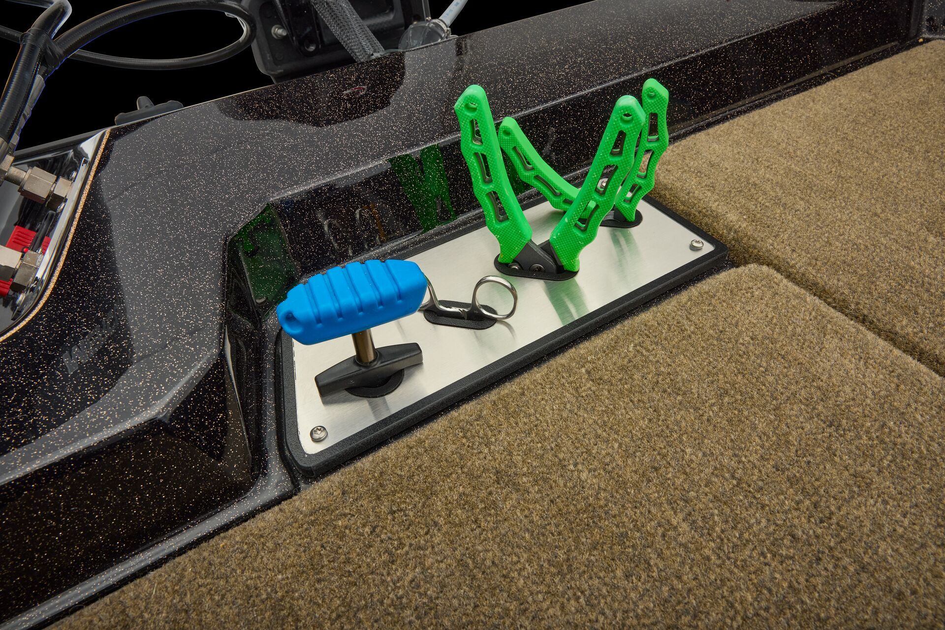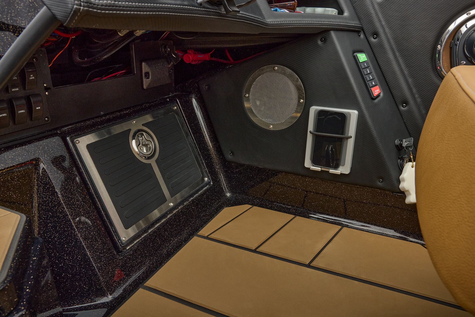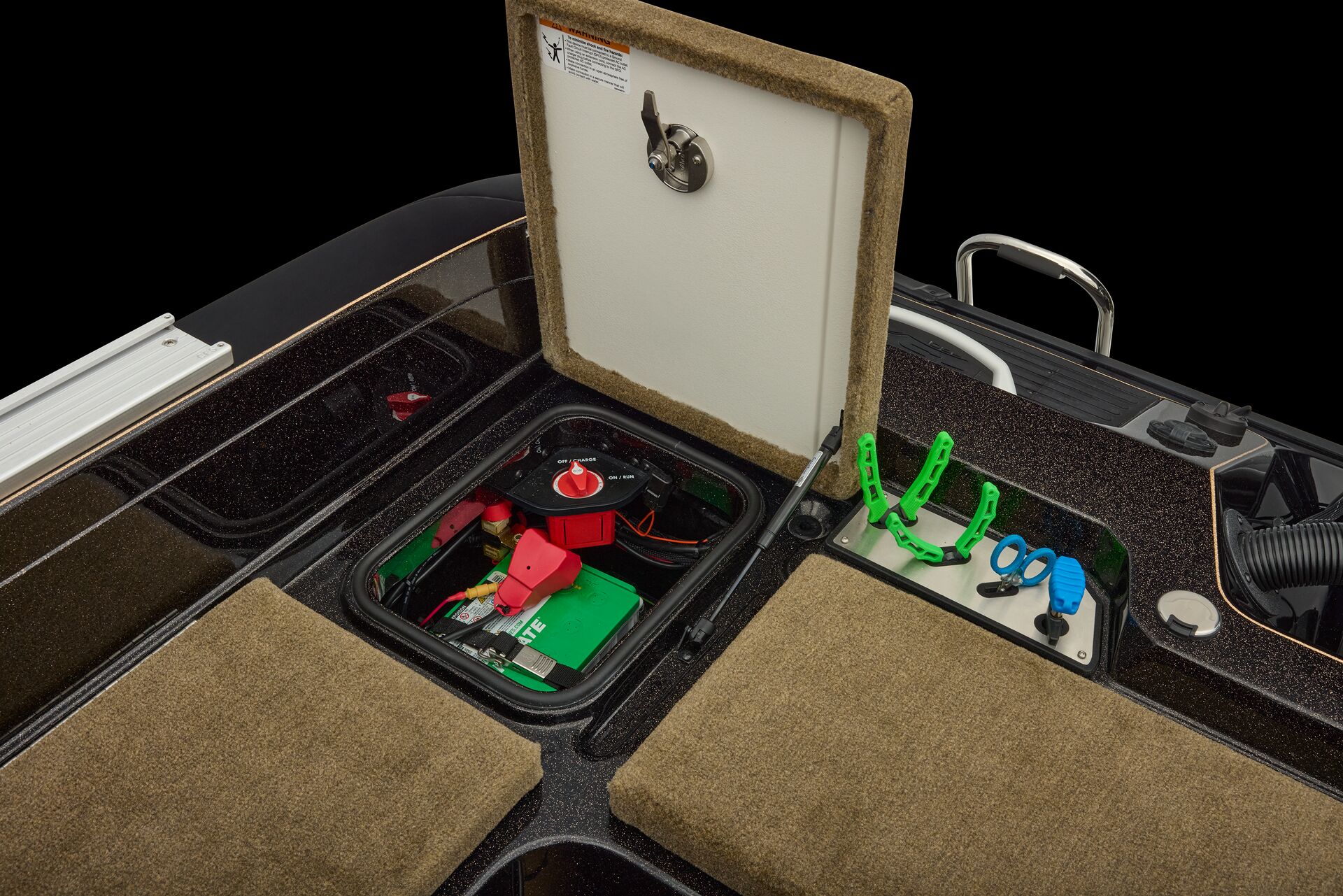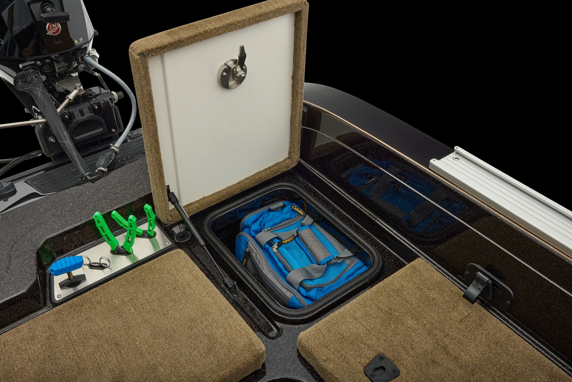 stepping through the distortion-free walk-thru windshield to the colossal back deck is an angler’s delight. Traction pad flooring with Comanche stripes adds functional beauty, while the stern houses tackle storages, dryboxes, and a massive livewell built to