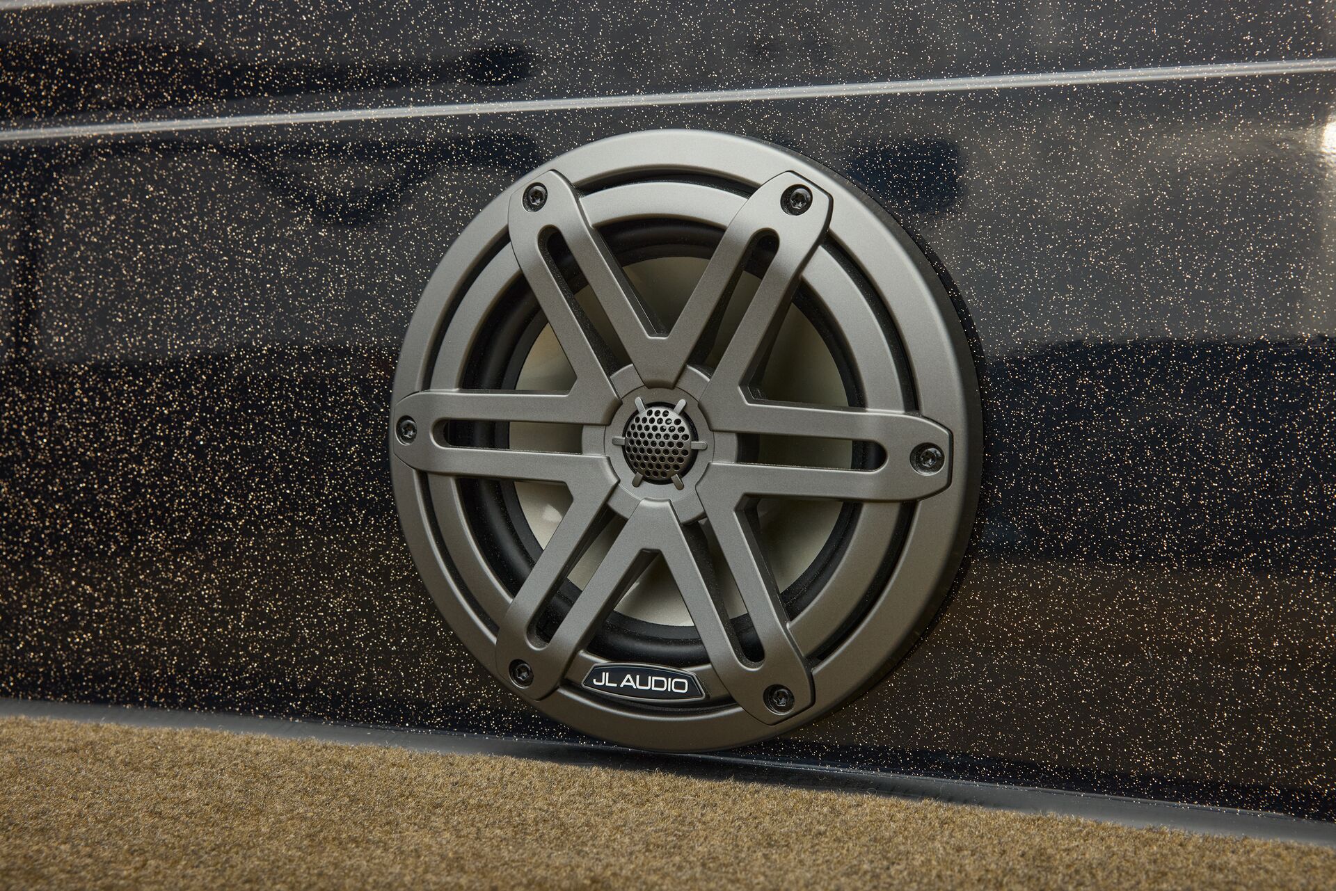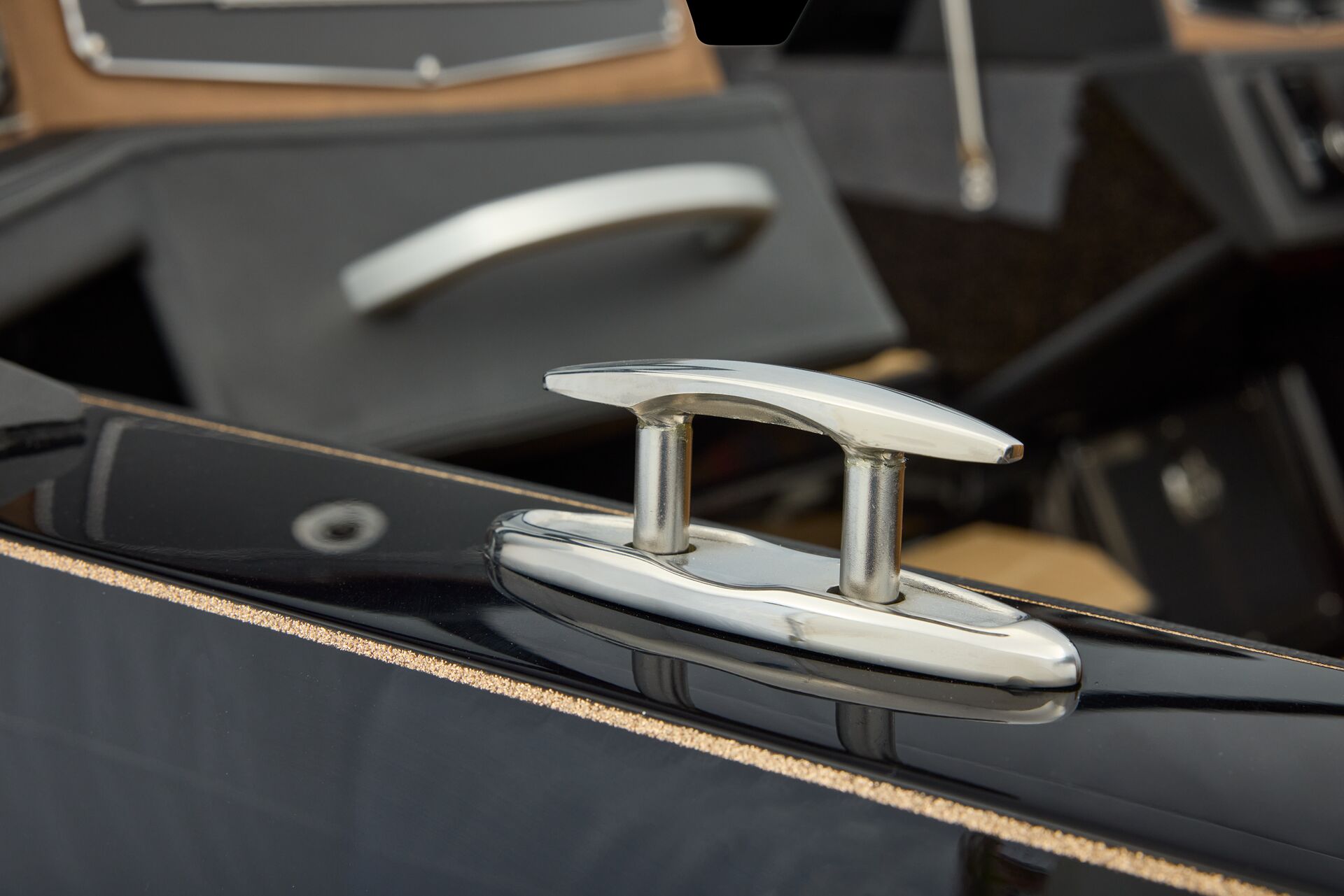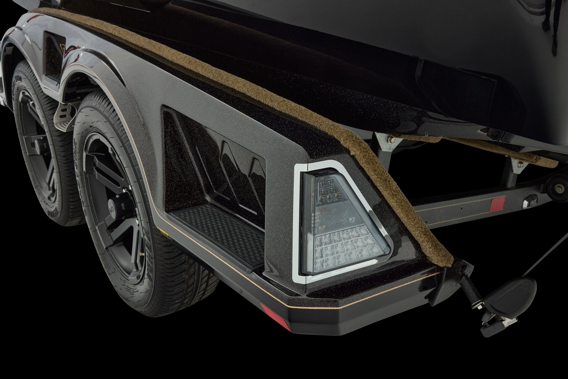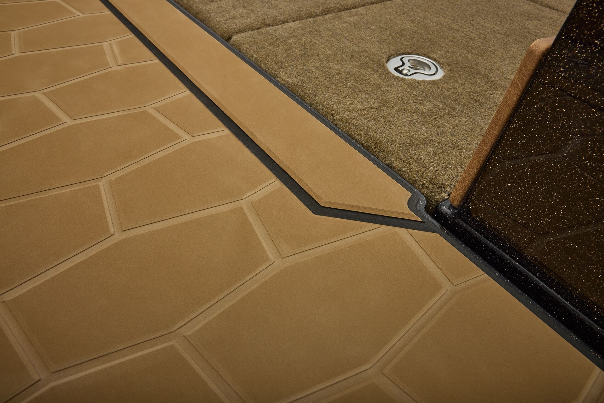 stepping through the distortion-free walk-thru windshield to the colossal back deck is an angler’s delight. Traction pad flooring with Comanche stripes adds functional beauty, while the stern houses tackle storages, dryboxes, and a massive livewell built to