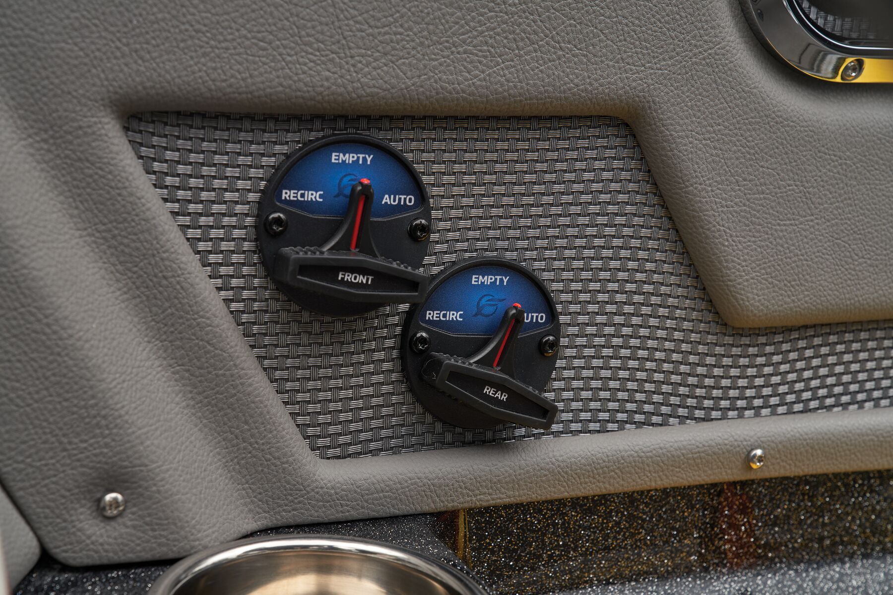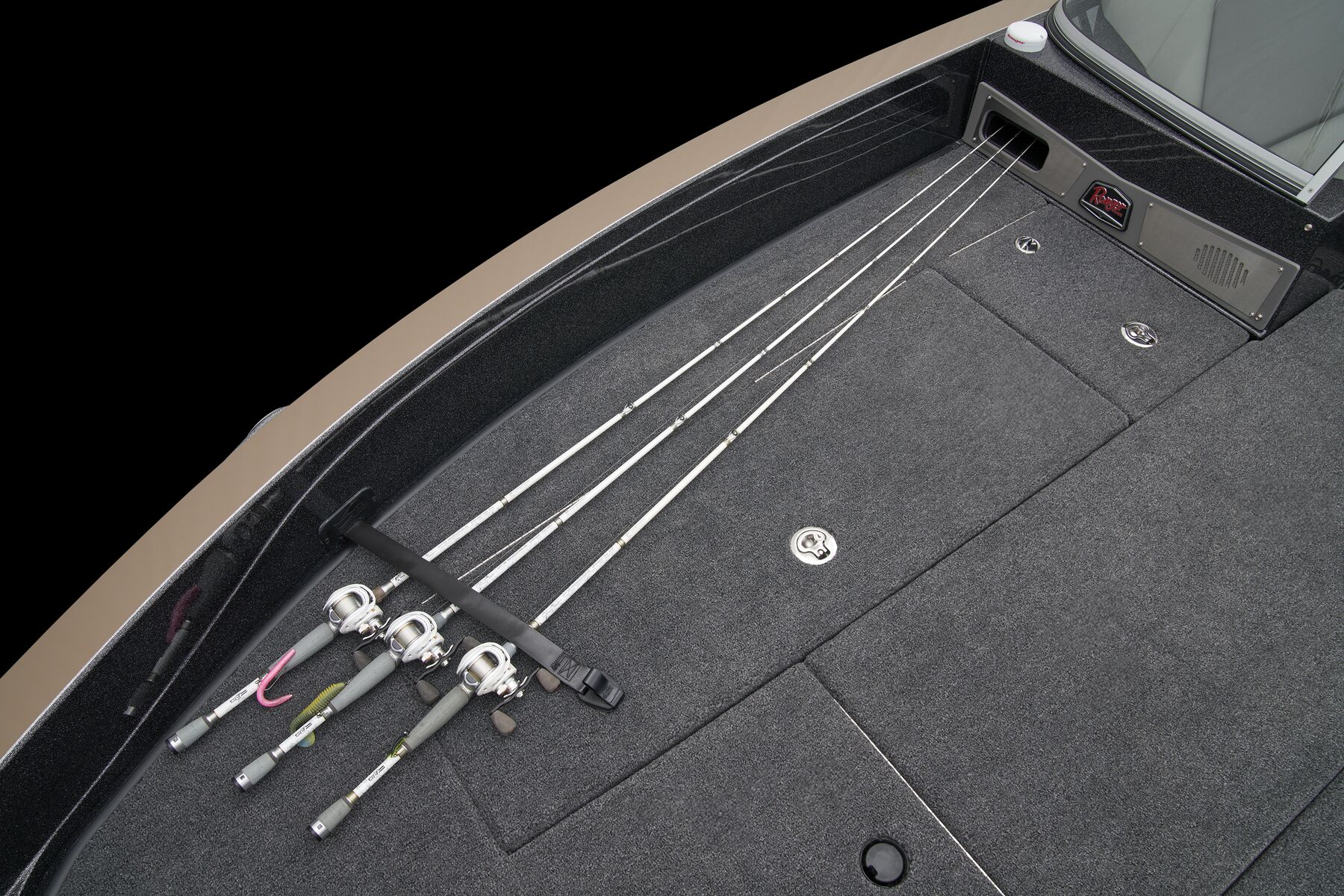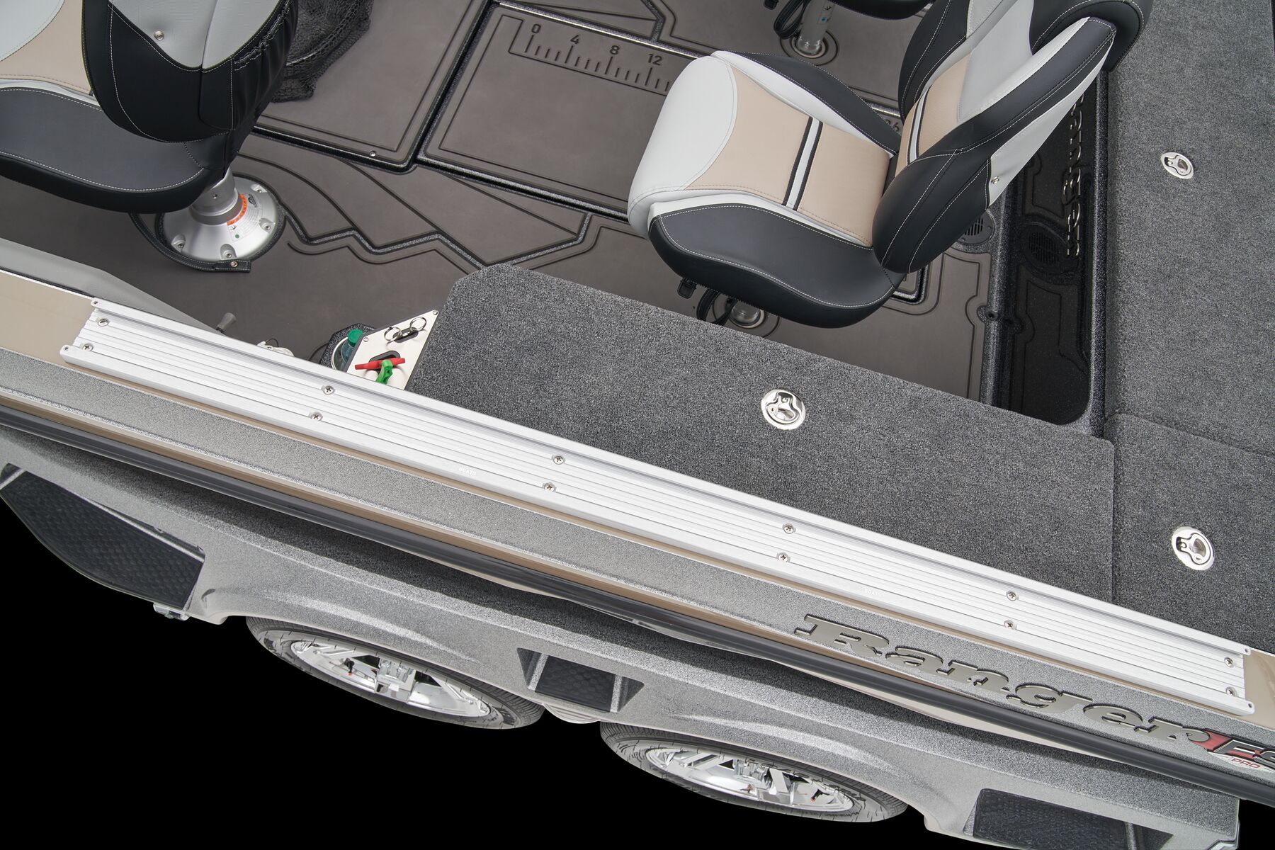 The monster front deck is the largest we’ve ever featured on a Deep V, and its size continues underneath, where you can stow a cache of rods up to 9’ with a wealth of tackle and gear. The cockpit is equally massive and offers storage for dozens of tackle boxes, more rods, and your winning stringer in the oversized livewell. A standard Ranger RIDE system keeps tabs on your outboard as well as gives you control of every major boat function—all in one 8” touchscreen. The consoles feature a premium stitched finish for a high-class automotive feel that match the brushed aluminum speaker grilles and handles and the shock-absorbing SRS Soft Ride™ seating.