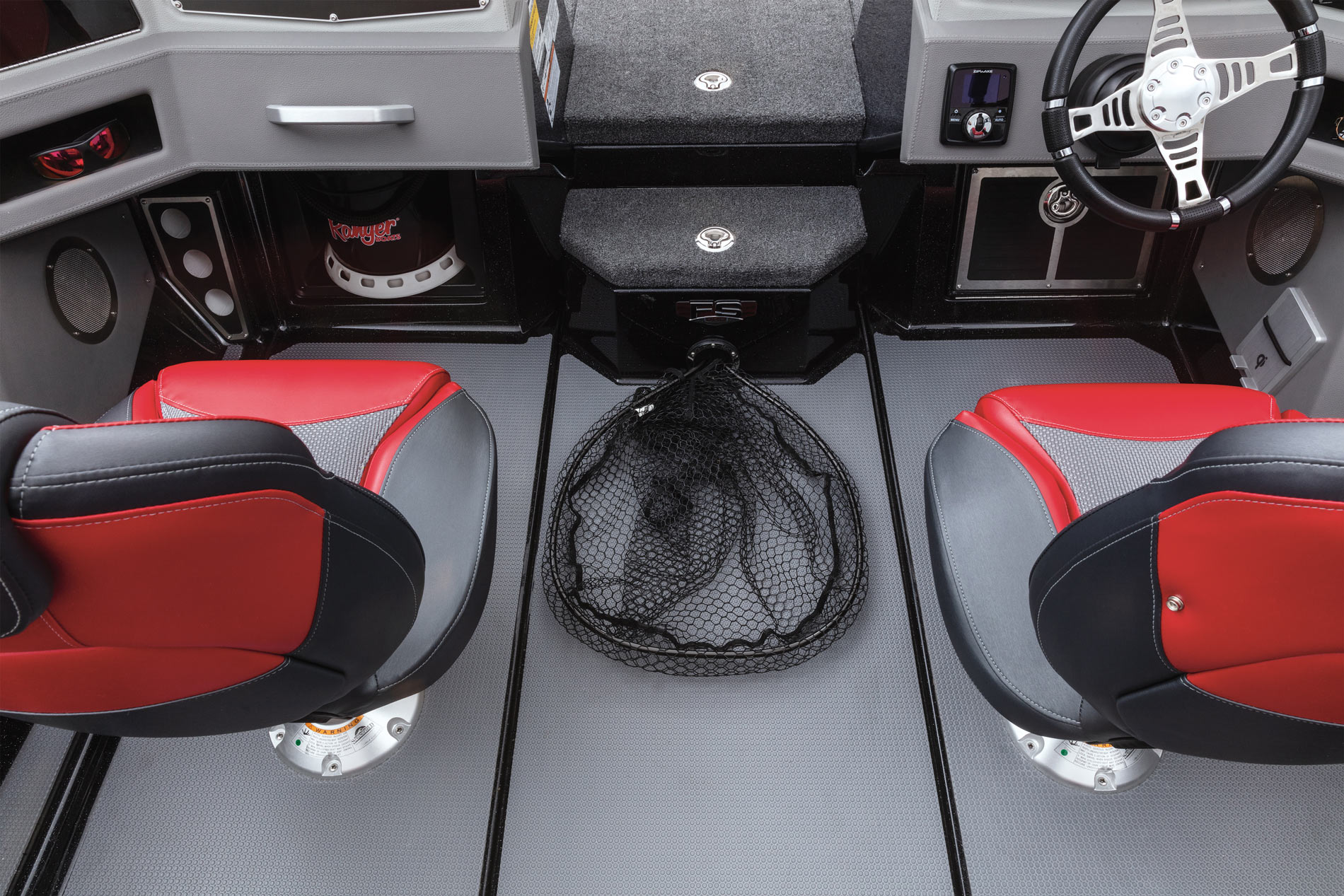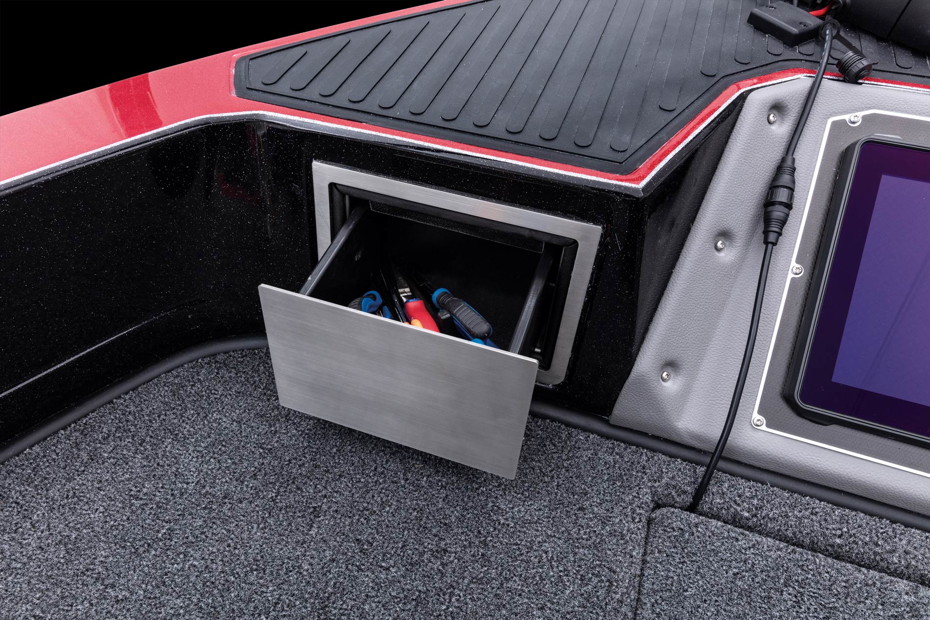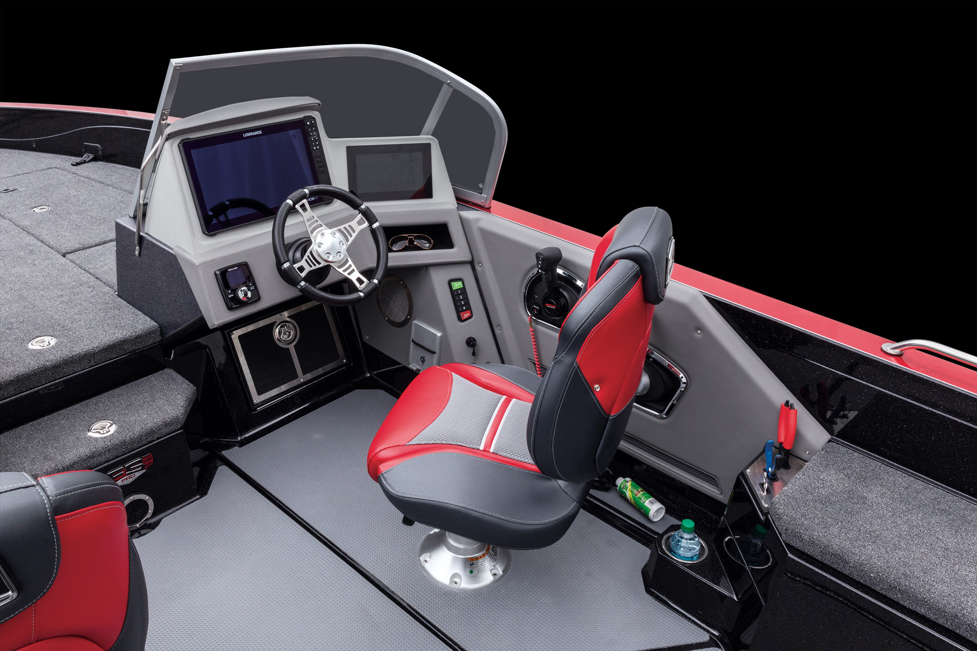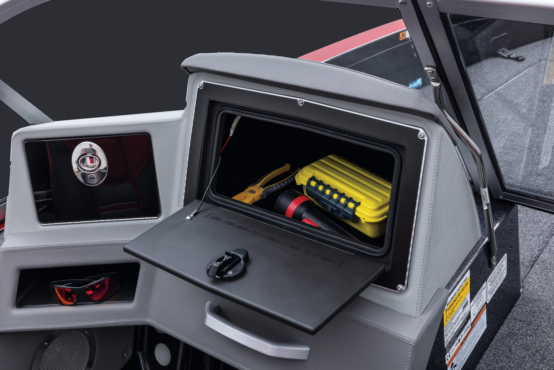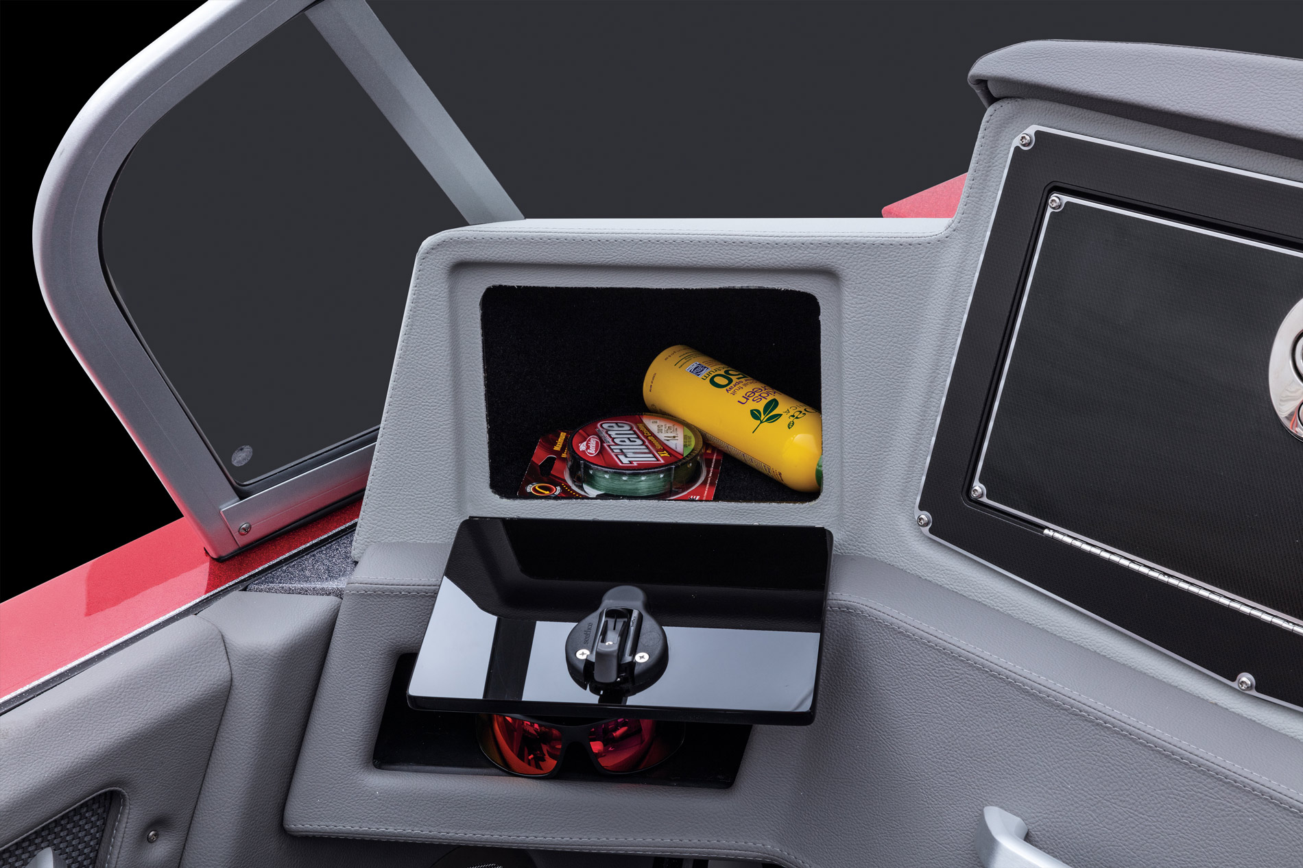 Inside, a full non-skid cockpit boasts the largest storage capacity we’ve ever featured in a 21-foot Deep V. Store dozens of tackleboxes in the saddle stows and scores of rods up to 8’6” in the lockable center and port rod boxes. Twin passenger glove boxes and a driver’s footrest storage keep essentials hidden and dry while multiple tool and cup holders keep other necessities handy.