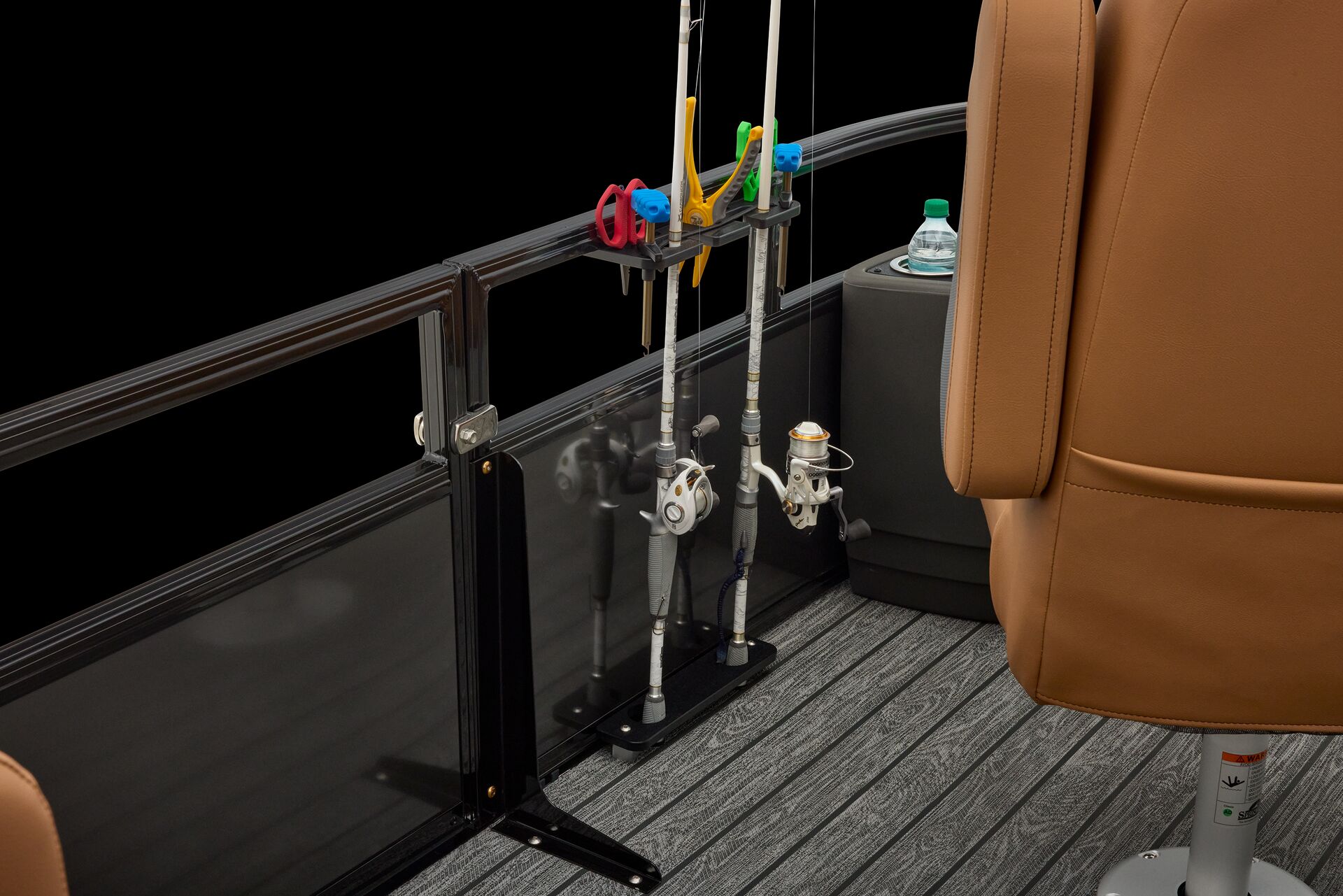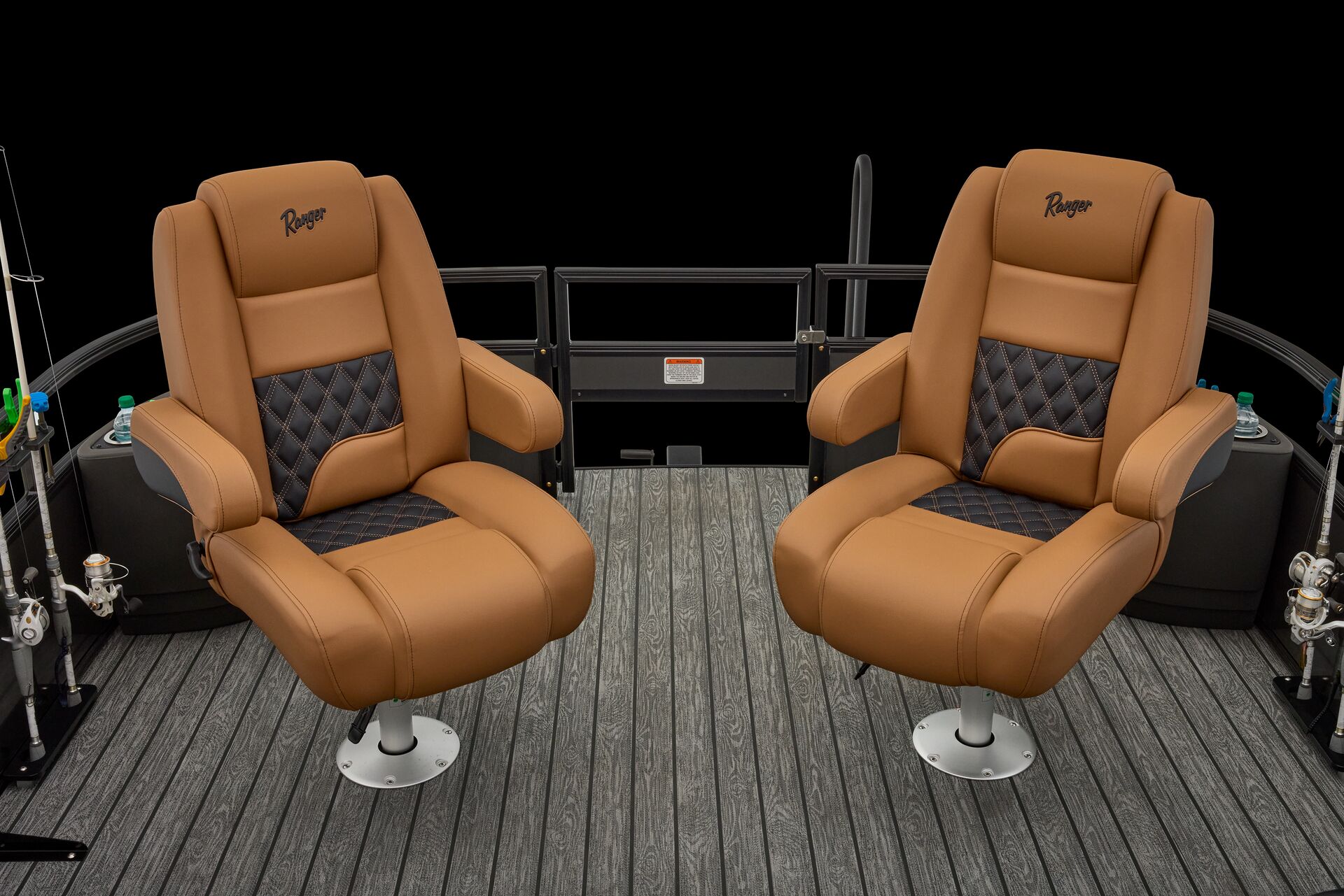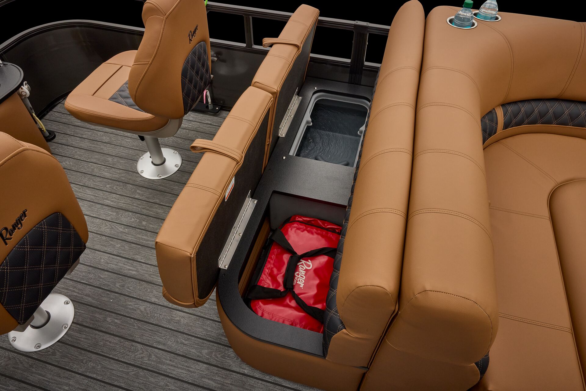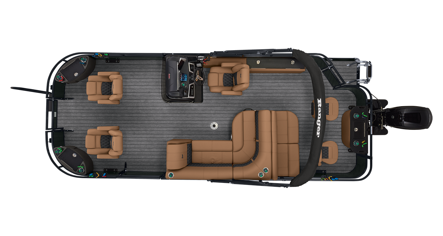 Whether the urge to fish strikes, you want a machine that’ll fit your whole crew and all your gear. The Ranger 220F is a fishing-first pontoon that’s loaded with all the fishing necessities and doesn’t skimp on creature comforts. Every inch of this all-in-one pontoon has something for everyone. For fishing features, fore and aft fishing stations feature livewells, rod and tool holders, and plush, premium seats. The front are captain's chairs with self-leveling arms that swivel 360 degrees. An optional trolling motor lets you sneak up in the shallow where lunkers lurk. A lockable rod box stows your sticks securely out of the way, but ready to go at a moment’s notice.